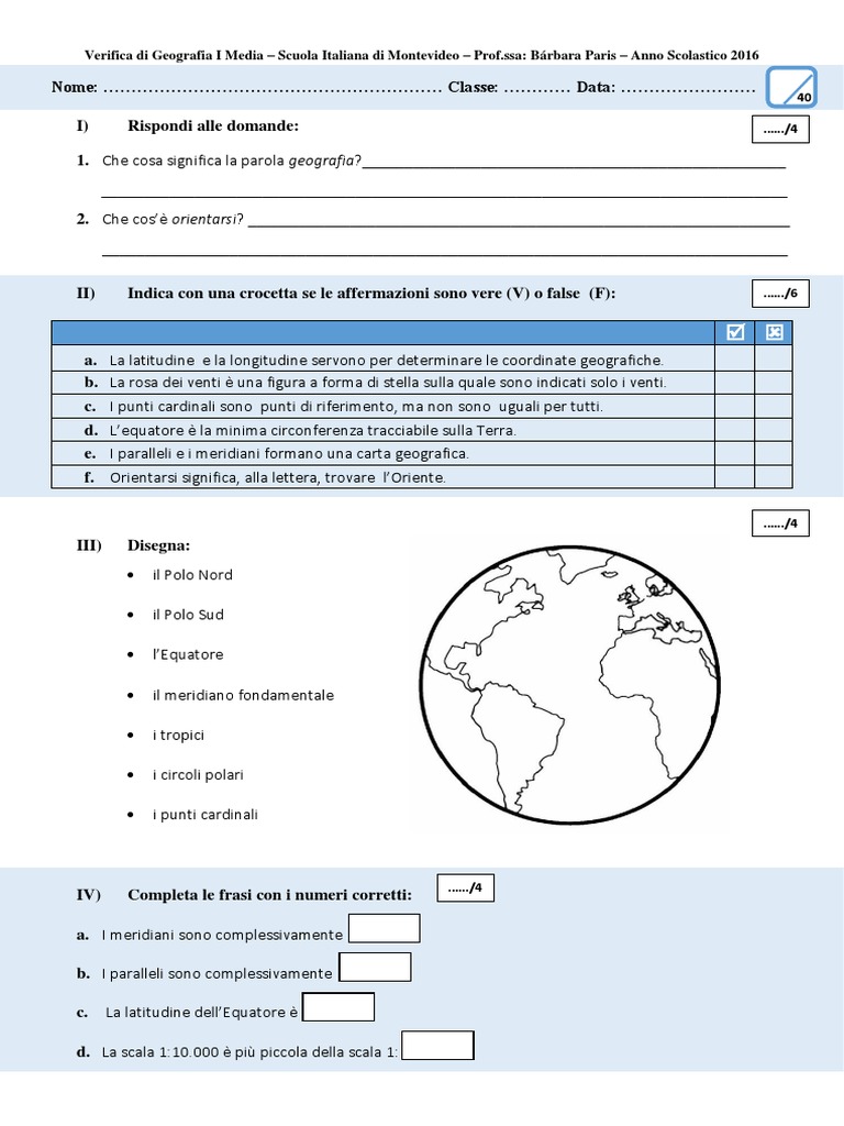 Verifica Geografia Prima Media Meridiani E Paralleli